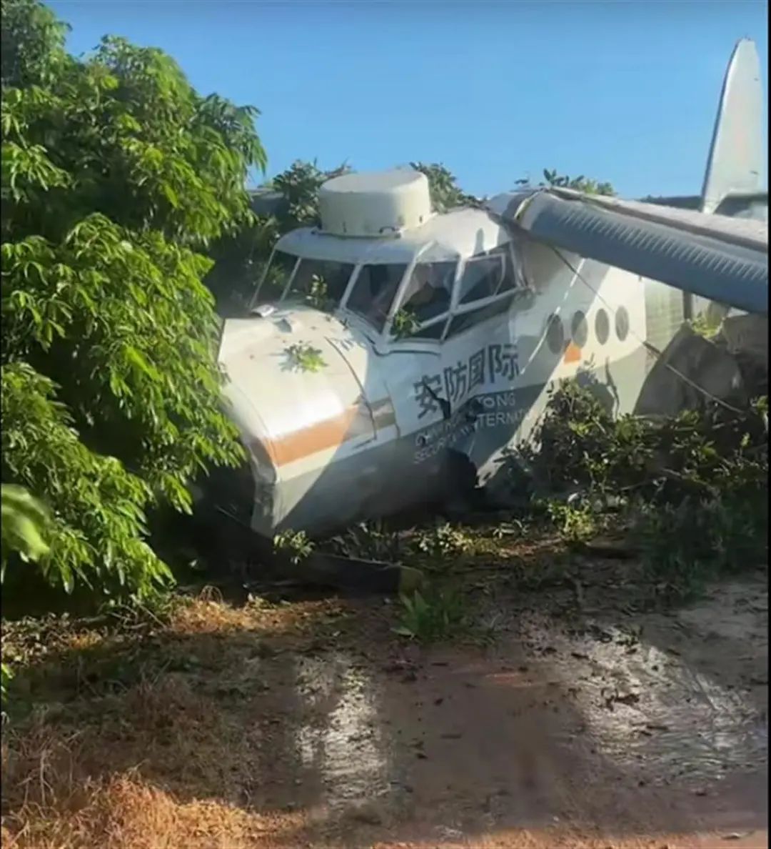 网友发布的视频显示,一架白色飞机坠落地上,机身印有“安防国际”四个字。视频拍摄者说:“(飞机)掉下来十分钟了,还在漏油,地上全都是油。”