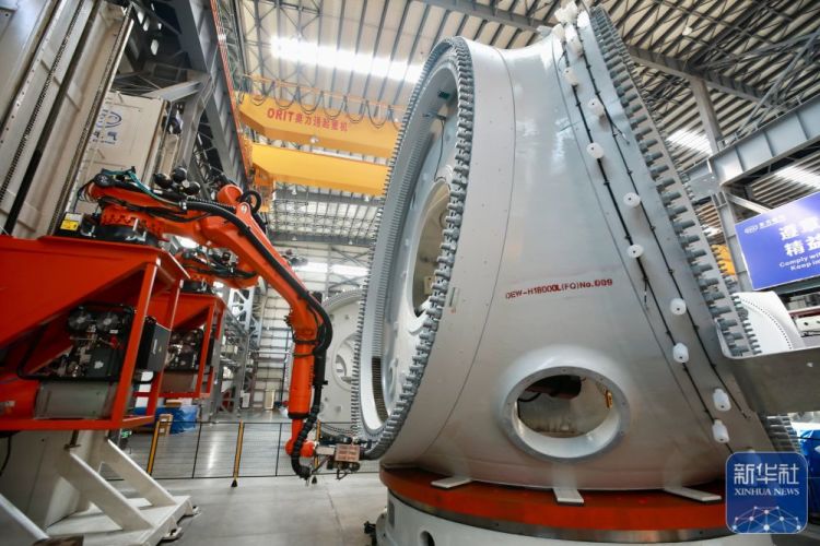 ↑8月8日,在福建三峡海上风电国际产业园东方电气风电(福建)有限公司的生产现场,机械臂在生产18兆瓦半直驱海上风电机组。