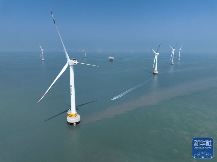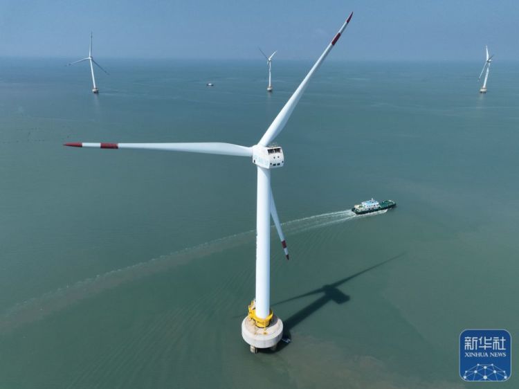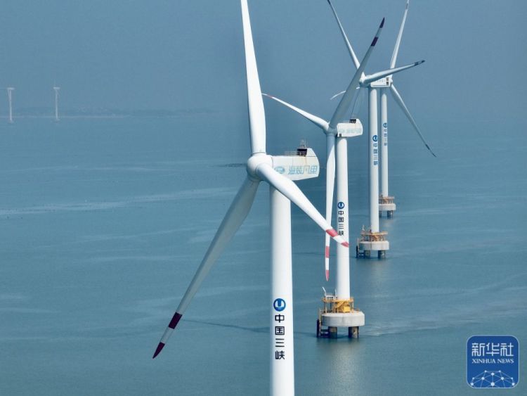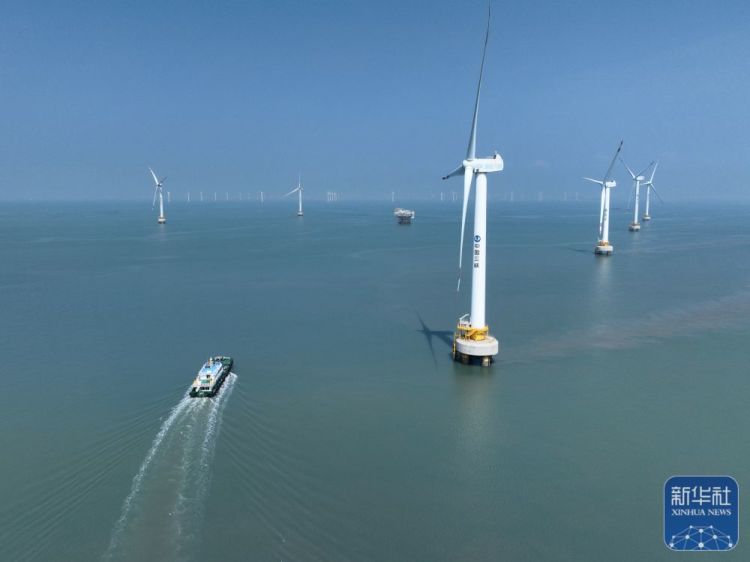 ↑这是8月8日拍摄的三峡福清兴化湾海上风电场(无人机照片)。福建三峡海上风电国际产业园自主生产的部分海上风电机组在这里装机投产。