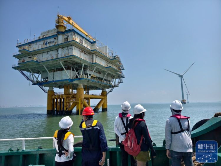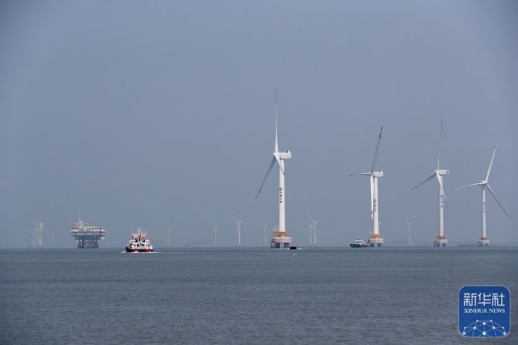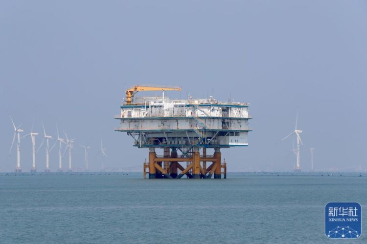 ↑这是8月8日拍摄的三峡福清兴化湾海上风电场海上升压站。福建三峡海上风电国际产业园自主生产的部分海上风电机组在这个风电场装机投产。