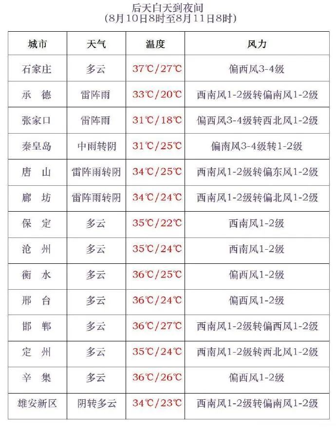 今天夜间,张家口西部、保定西部和石家庄、衡水及以南地区多云转阴有雷阵雨或阵雨,其中保定西部、石家庄西部、邢台西部、邯郸有中雨到大雨,个别地点有暴雨,雷雨时局地伴有短时强降水、短时大风等强对流天气,其他地区晴转多云。最低气温,张家口、承德、保定西北部17~22℃,其他地区23~26℃。