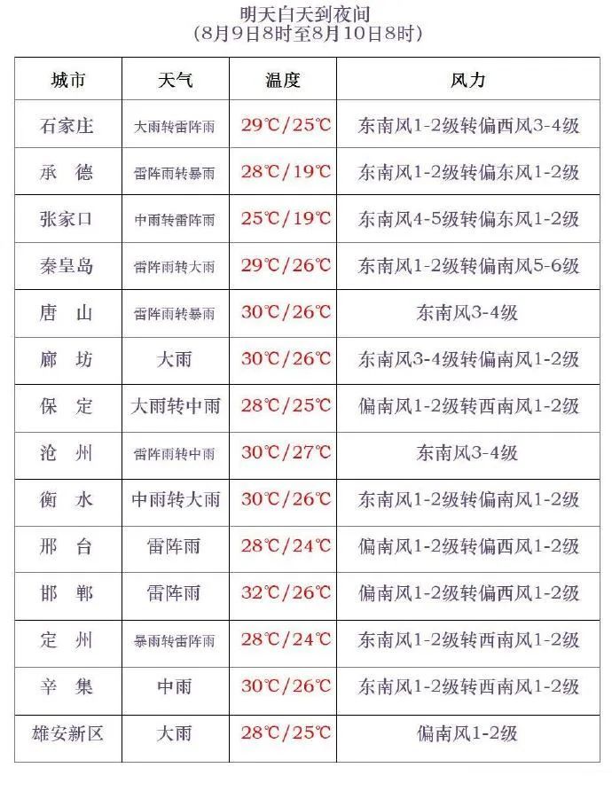 明天夜间,全省阴,承德大部、唐山、秦皇岛、保定东部、雄安新区、廊坊、沧州西部、衡水北部有大雨,部分地区有暴雨,局地有大暴雨,其他地区有小雨到中雨,雷雨时局地伴有短时强降水、短时大风等强对流天气。