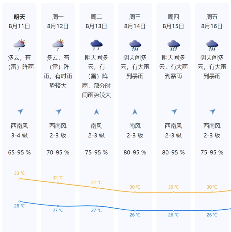 11-12日多云,间中有(雷)阵雨,有时雨势较大,酷热程度有所缓解,但中北部最高气温仍可达35℃;