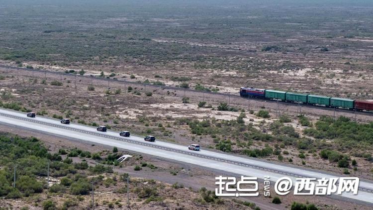 丝路万里行车队驶入哈萨克斯坦境内,偶遇货运火车。两支“钢铁驼队”齐头并进,鸣笛致敬。