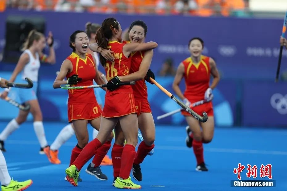 图为8月10日在巴黎奥运会女子曲棍球决赛中,中国队员相拥庆祝进球。中新社记者 富田 摄