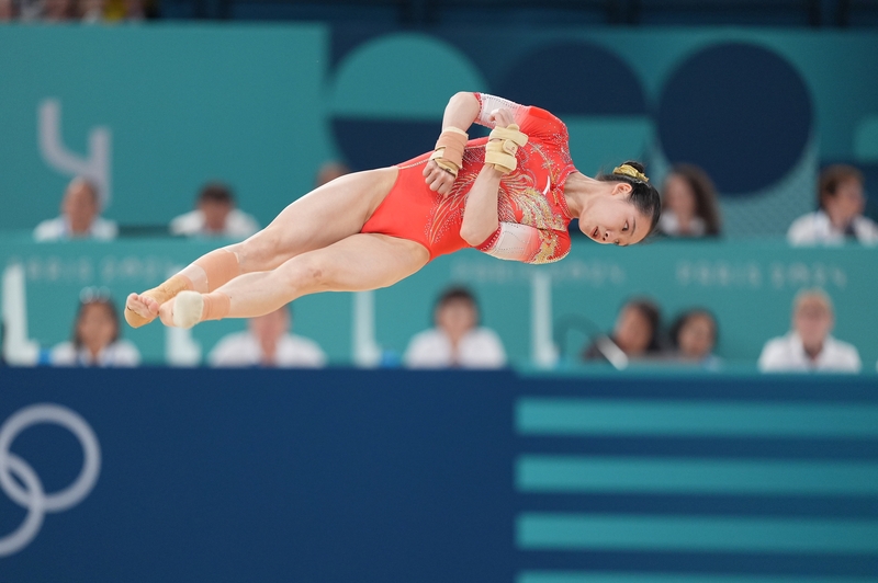 在巴黎奥运会竞技体操女子团体决赛中,由罗欢、欧钰珊、邱祺缘、张怡涵和周雅琴组成的中国队获第六名(IC photo)