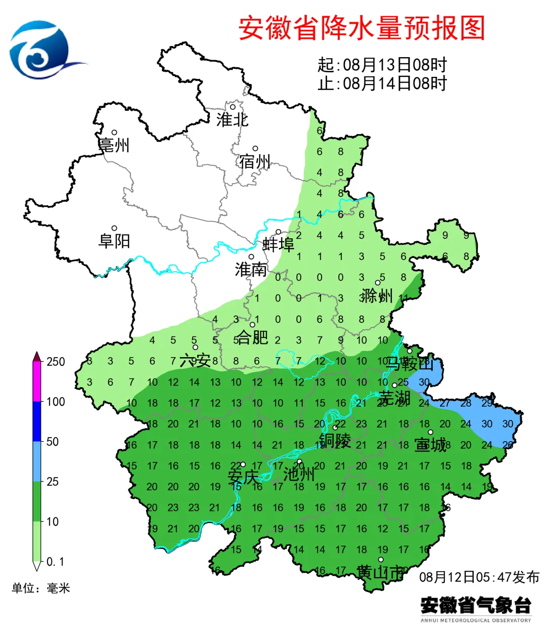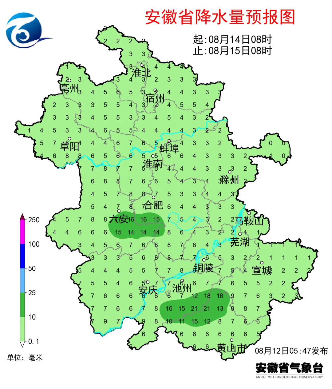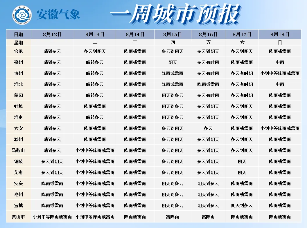 12日大别山区和江南、13日淮河以南的部分地区有雷阵雨天气,并伴有局地短时强降水、8~10级雷暴大风等强对流性天气。14日后全省仍多雷阵雨:14日全省大部分地区有阵雨或雷雨,局部中雨;15-17日沿淮淮北、大别山区和江南部分地区多雷阵雨天气;18-20日我省还有一次降水过程。