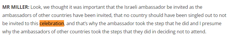 对此,米勒回答说,“我们认为邀请以色列大使和邀请其他国家的大使一样重要,任何国家都不应该单独不被邀请参加这次庆典,这就是为什么大使采取了他所采取的措施,我想这也是为什么其他国家的大使采取了他们所采取的措施,决定不参加。”