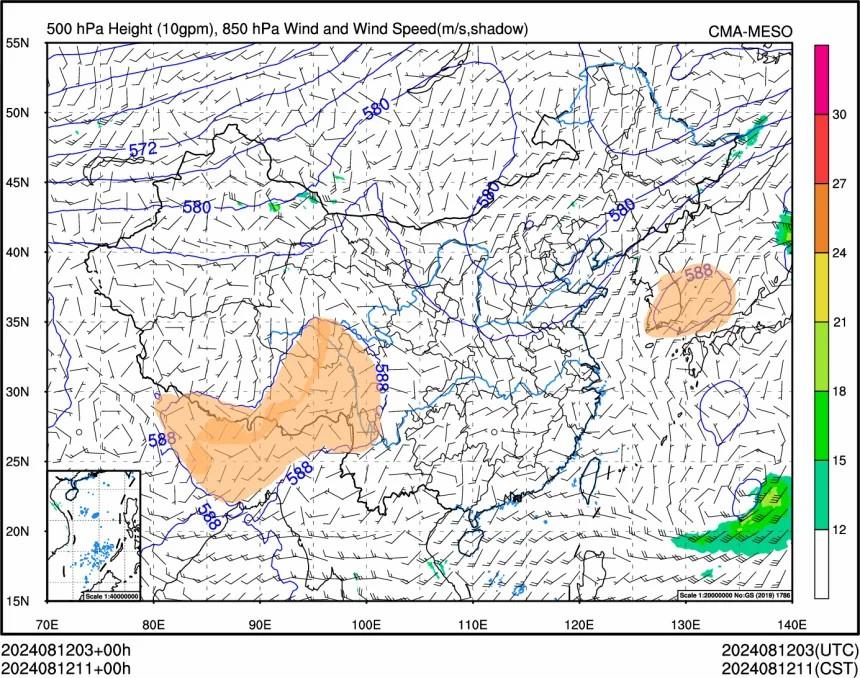△588线位置代表副热带高压大致位置,主体已撤退出南方。