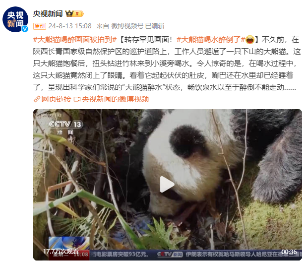 不久前,在陕西长青国家级自然保护区的巡护道路上,工作人员邂逅了一只下山的大熊猫。这只大熊猫饱餐后,扭头钻进竹林来到小溪旁喝水。令人惊奇的是,在喝水过程中,这只大熊猫竟然闭上了眼睛。看着它起起伏伏的肚皮,嘴巴还在水里却已经睡着了,呈现出科学家们常说的“大熊猫醉水”状态,畅饮泉水以至于醉倒不能走动……