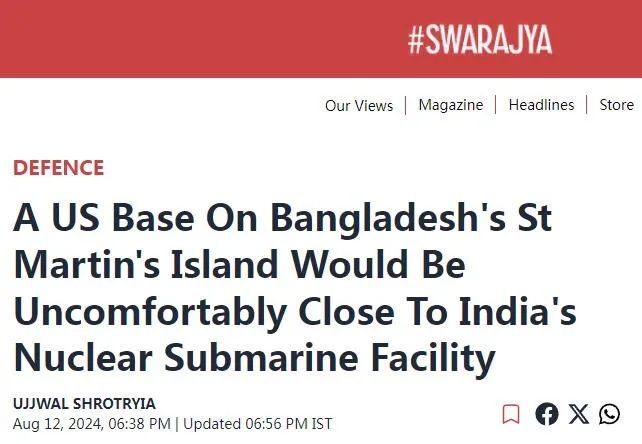 孟加拉国前总理哈西娜日前透露自己被赶下台的原因是她拒绝将圣马丁岛交给美国,“这一行为将使美国在孟加拉湾获得战略优势”。不少西方媒体认为美国此举的主要目的是“抗衡中国在印度洋的影响力”“监视中国海军在印度洋的活动”,但印度海军却首先感到了威胁——至关重要的印度核潜艇基地将直接暴露在美军刀锋之下。
