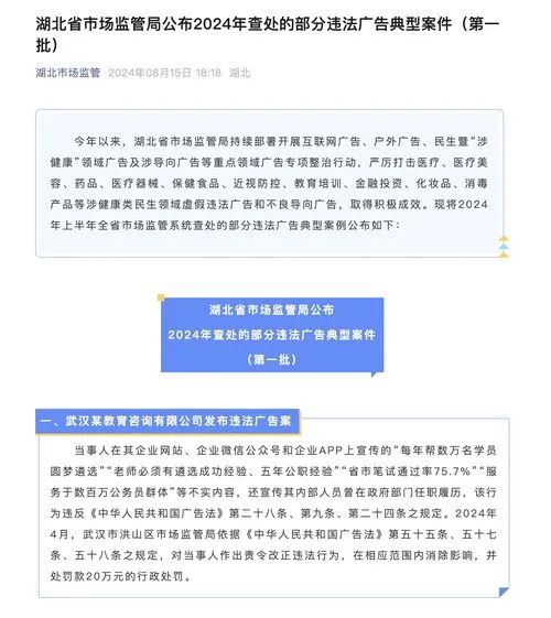 日前,湖北省市场监管局公布2024年查处的首批20个违法广告典型案件,其中就包括这起武汉某教育咨询有限公司发布违法广告案。