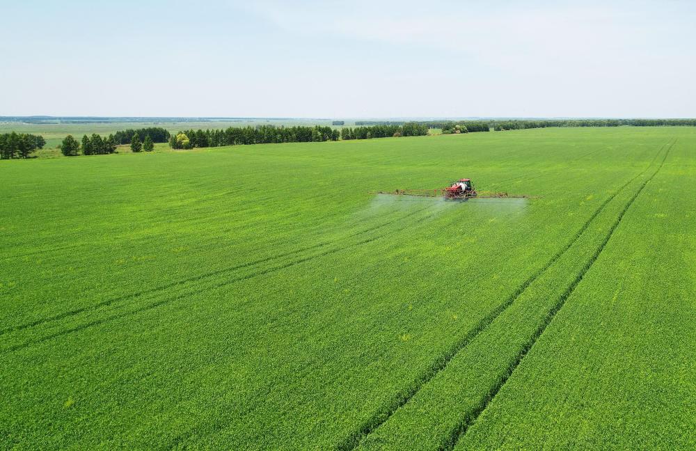 在北大荒集团红星农场有限公司一块有机麦田,大型机车在进行喷施生物液肥作业(无人机照片)。新华社发(侯越摄)