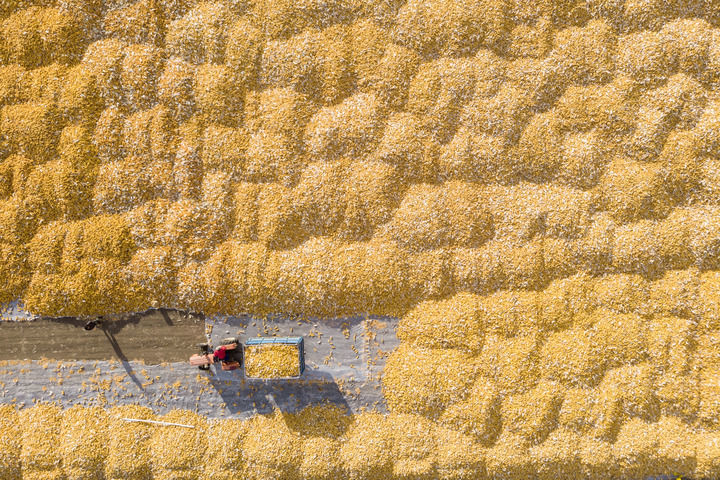 在黑龙江省肇东市五里明镇东升村,农民把收获的玉米运到当地农业合作社指定的地点进行晾晒(2023年10月19日摄,无人机照片)。新华社记者 谢剑飞 摄