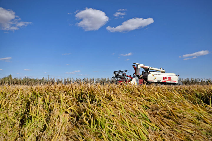 农业机械在辽宁盘锦市辽河三角洲尤巧元家庭农场的稻田里收割水稻(2023年10月20日摄)。新华社记者 姚剑锋 摄