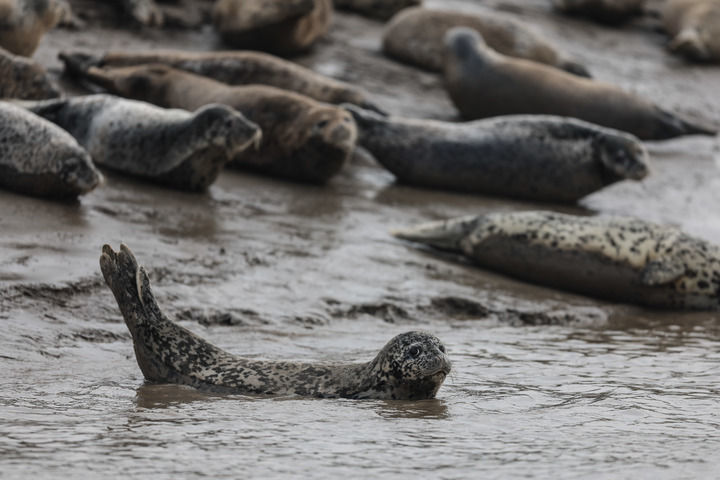 西太平洋斑海豹在辽宁盘锦三道沟海域的滩涂上休息(2024年4月9日摄)。新华社记者 潘昱龙 摄