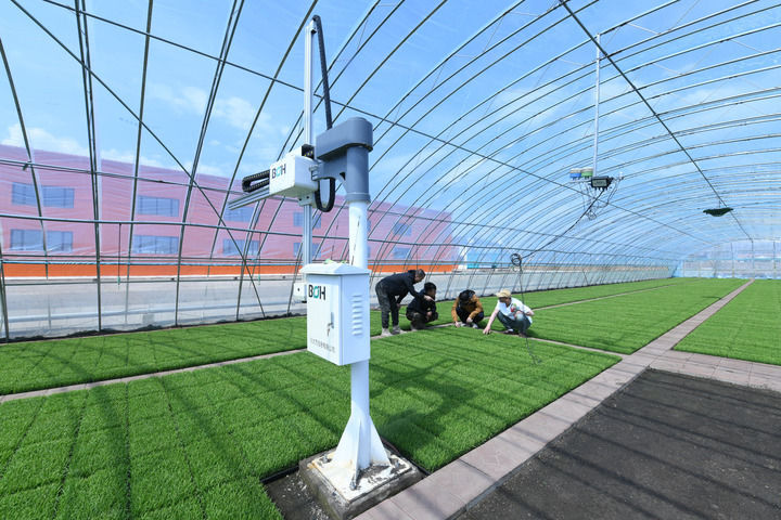 在黑龙江北大荒农业股份有限公司友谊分公司水稻智能育秧中心的水稻育秧大棚中拍摄的智能控温控水管理系统(2024年4月24日摄)。新华社记者 王松 摄
