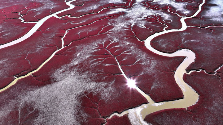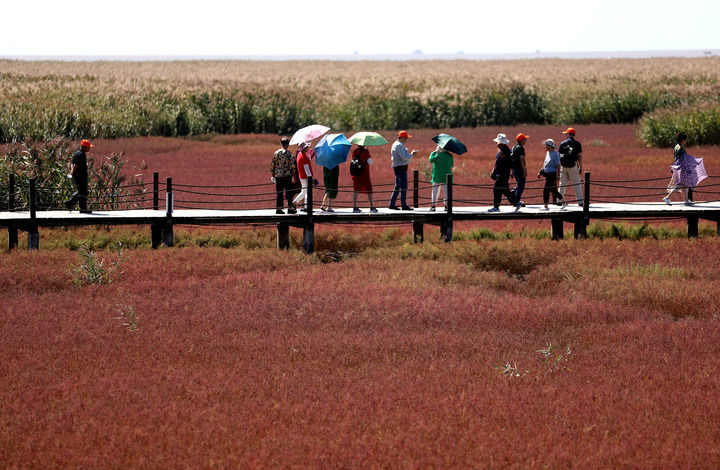 “景区内3万亩红海滩与海洋、芦苇荡构成了一幅奇美画面,是难得一见的河口湿地景观。”盘锦红海滩旅游发展有限公司董事长孙焕新这样说。