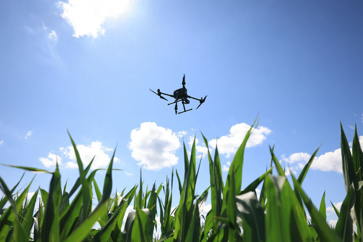 在黑龙江北大荒集团赵光农场有限公司农业科技园区,一台智能无人机按照规定时间、规定路线进行自动巡田作业(2024年7月22日摄)。新华社发(钱泊羽摄)