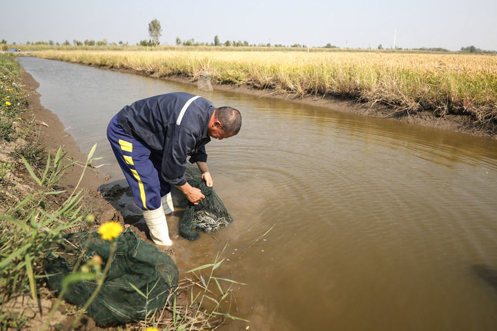 工作人员在辽宁盘锦市大洼区三角洲“蟹稻+”综合种养模式试验基地的稻田收获河蟹(2022年9月28日摄)。新华社记者 潘昱龙 摄