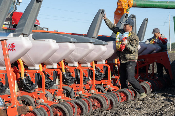 农民在黑龙江省集贤县一片耕地里向播种机中添加大豆种子(2024年5月9日摄)。新华社记者 谢剑飞 摄