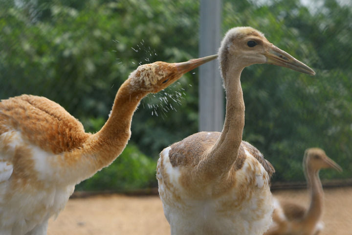 丹顶鹤雏鸟在辽宁盘锦市林业和湿地保护服务中心鹤类繁育保护站内嬉戏(2023年8月3日摄)。新华社记者 陈为 摄