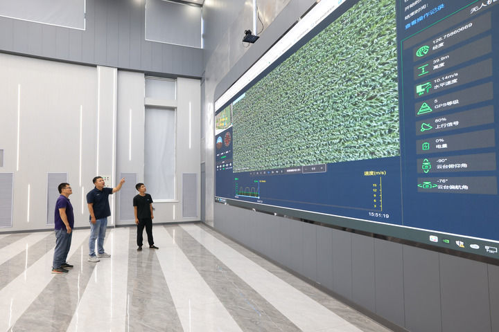 在黑龙江北大荒集团赵光农场有限公司科技服务中心,农业科技人员通过田间物联网系统在数字农业指挥大厅实时观看智能无人机回传的视频,及时查看田间作物长势情况(2024年7月22日摄)。新华社发(钱泊羽摄)