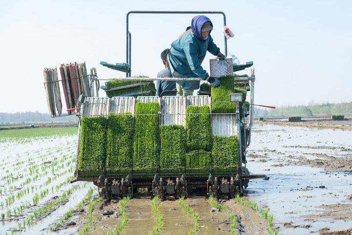 在黑龙江北大荒集团前哨农场有限公司,农民驾驶插秧机进行水稻插秧作业(2024年5月8日摄)。新华社记者 谢剑飞 摄