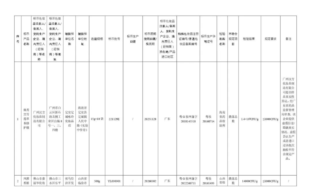 在2023年国家化妆品抽样检验工作中,经海南省药品检验所等单位检验,产品标签标示为广州汉方化妆品制造有限公司生产的韩秀宫雪莲草本修护膜等37批次化妆品不符合规定。其中,广州汉方化妆品制造有限公司提出样品真实性异议申请,经广东省药品监督管理局审查,被抽检不符合规定的产品确为上述生产企业备案或生产。上述企业提供虚假信息、隐瞒真实情况的行为属于《化妆品监督管理条例》规定的情节严重的情形,将依法从重从严处罚。