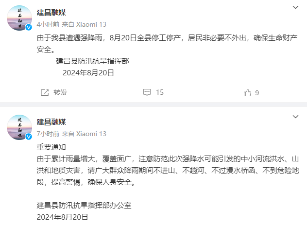 据辽宁省建昌县融媒体中心@建昌融媒 消息,由于建昌县遭遇强降雨,8月20日全县停工停产,居民非必要不外出,确保生命财产安全。