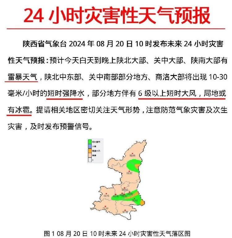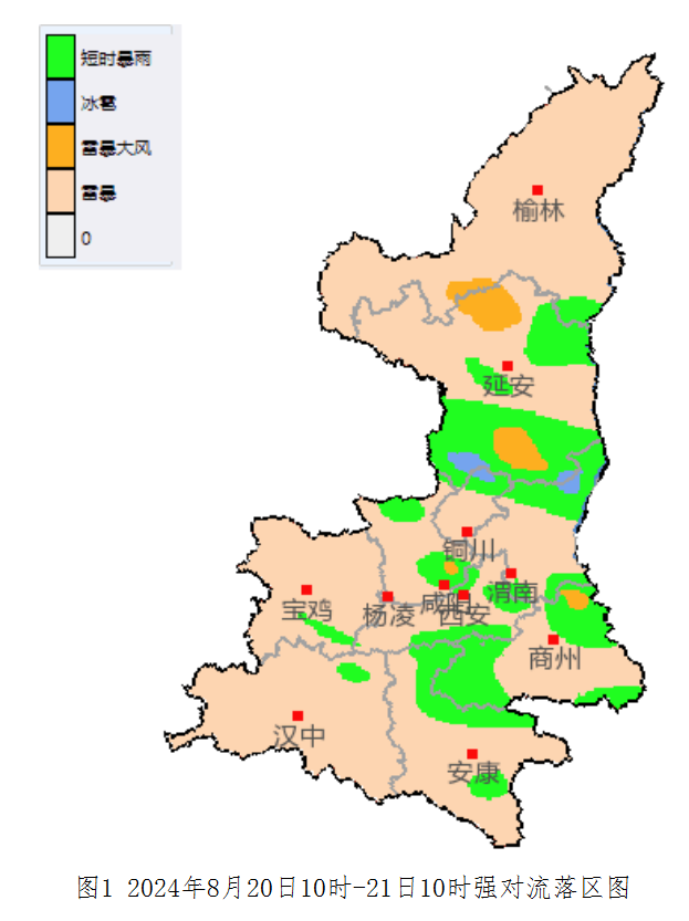 受冷涡和低层切变线影响,预计8月20日10时至21日10时榆林南部、延安部分、铜川、西安部分、渭南部分、咸阳部分、宝鸡南部、汉中北部、安康北部及东部、商洛部分 有短时强降水 ,最大小时雨强10-30mm/h,局地可达50mm/h以上。上述地区降水呈现面弱点强特征,有分散性暴雨 。降水期间伴有雷暴大风 (阵风7-8级,局地可达10级以上 )或冰雹等强对流天气 。