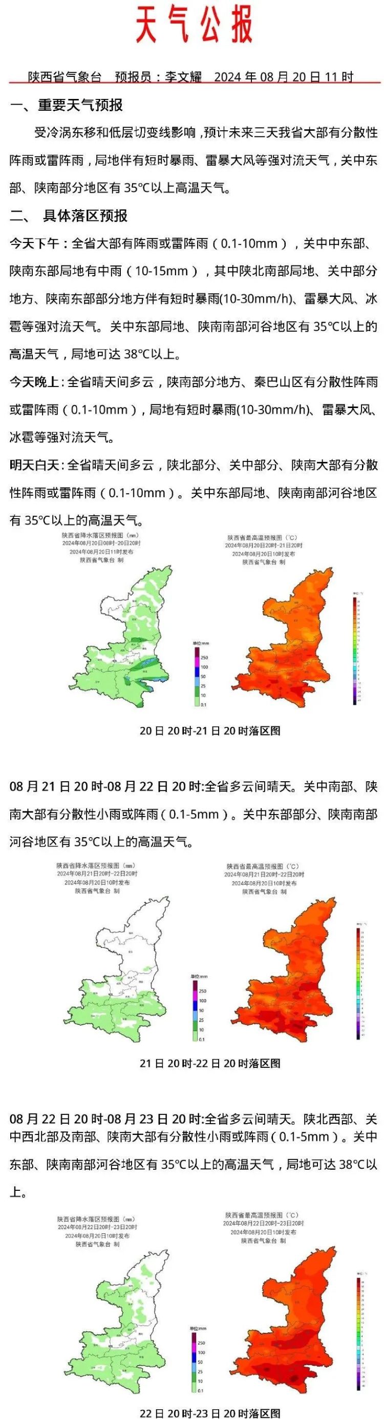 受冷涡东移和低层切变线影响,预计未来三天我省大部有分散性阵雨或雷阵雨,局地伴有短时暴雨、雷暴大风等强对流天气, 关中东部、陕南部分地区有35℃以上高温天气。