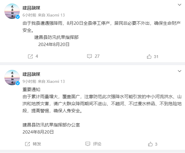 8月20日,辽宁省葫芦岛市建昌县发布全县停工停产的通知:“由于我县遭遇强降雨,8月20日全县停工停产,居民非必要不外出,确保生命财产安全。”