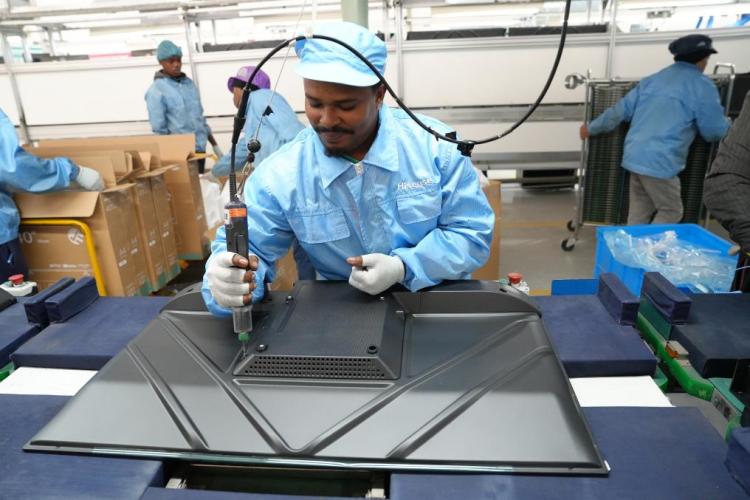 8月14日,在南非开普敦,当地员工在海信南非工业园的电视机生产线上工作。新华社记者王雷摄