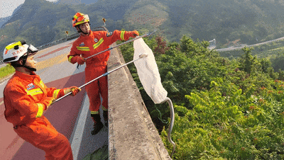 两名消防员将捕蛇器交替夹住蛇身