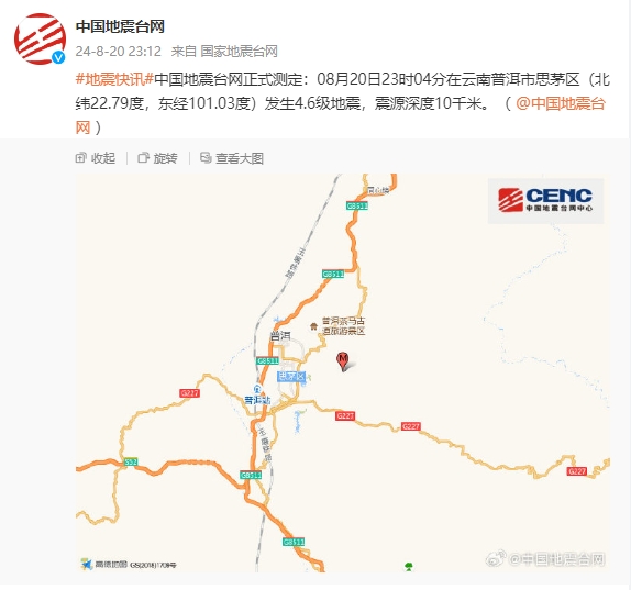中国地震台网正式测定:云南普洱市思茅区发生4.6级地震