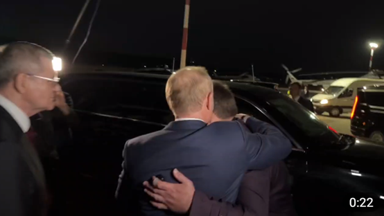 俄新社和卡德罗夫社交平台账号发布的视频显示,普京当晚抵达格罗兹尼后下机与迎接他的官员握手,并与卡德罗夫拥抱,随后两人一同上车离开。