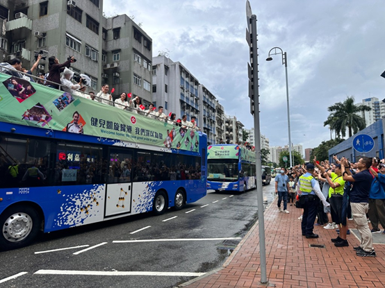 报道称,巴士于10时30分抵达港铁大围站外,马路两旁有数百市民等候,巴士停下时市民欢呼声不断,巴士上的运动员也挥动旗帜并向两旁市民挥手。巴士停泊约两分钟后离开。