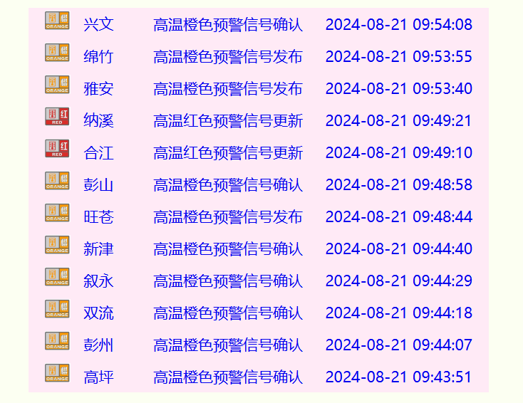 截至8月21日10时,四川多地已发布高温预警信号,其中泸州纳溪区、泸州合江县、泸州泸县、德阳中江县、绵阳盐亭县、绵阳三台县发布高温红色预警信号。