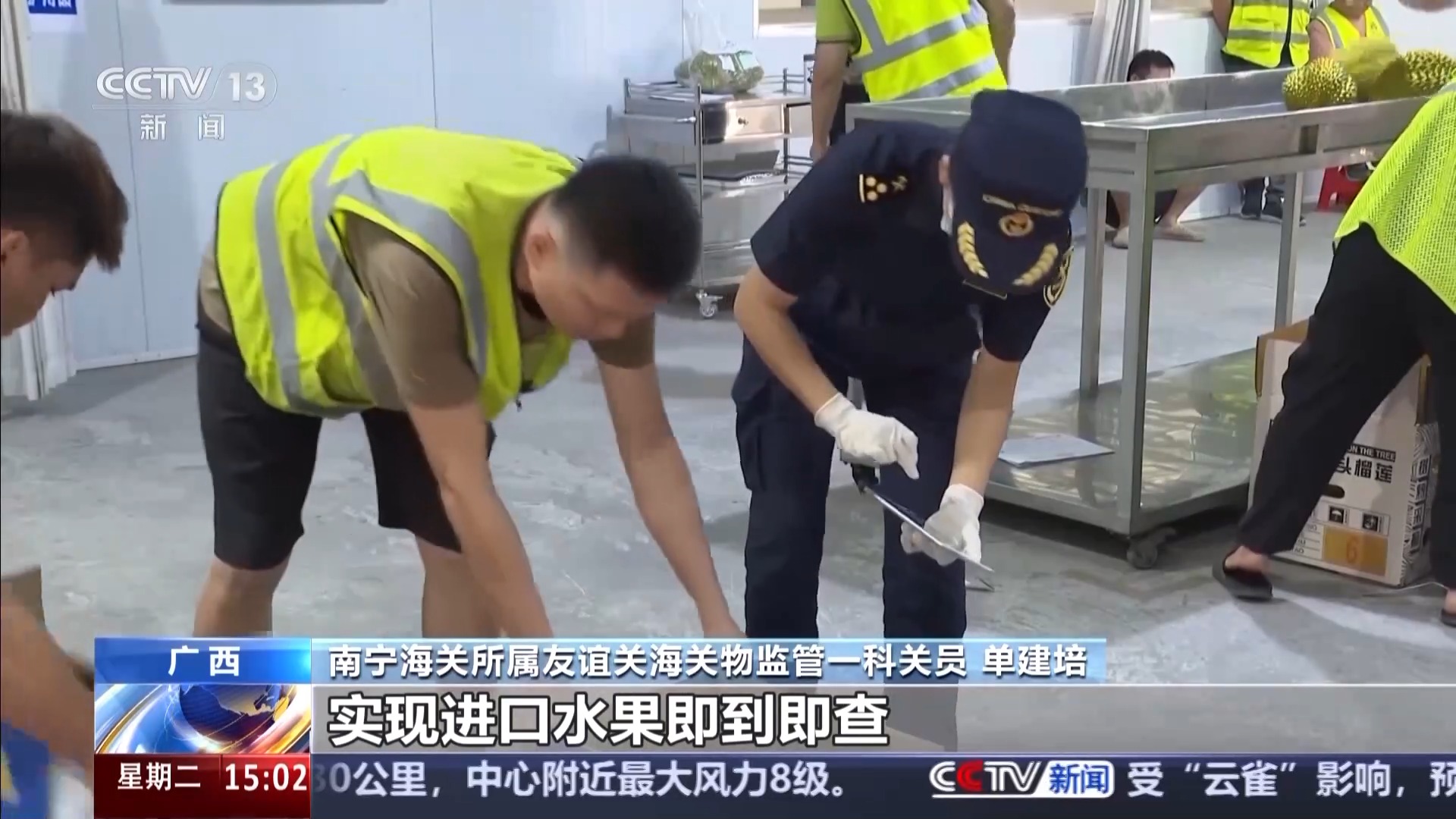 南宁海关所属友谊关海关物监管一科关员 单建培:友谊关口岸是广西最大的水果进口口岸,系统能自动识别查验车位空闲状态,自动通知车辆进场排队,压缩货物等待时间20%,查验车位周转率提升35%,实现进口水果即到即查。