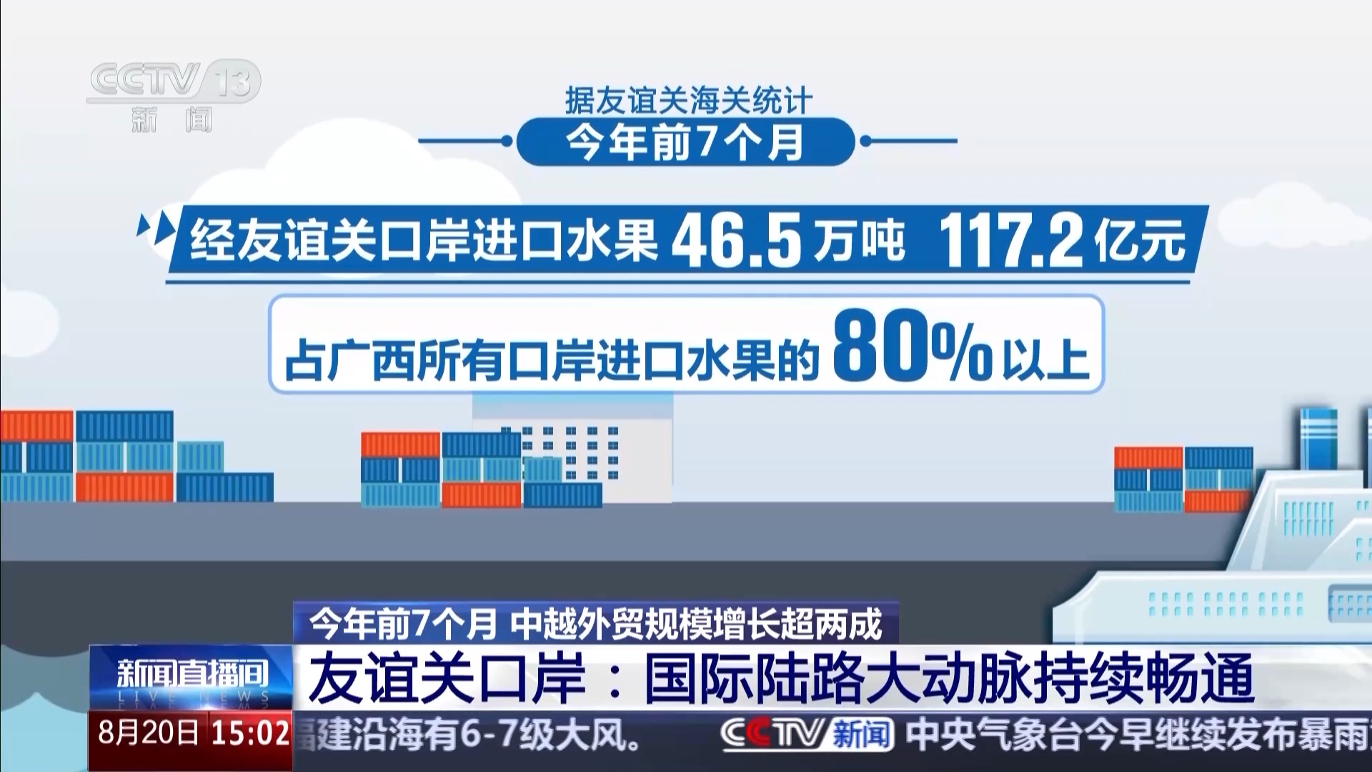 据友谊关海关统计,今年前7个月,经友谊关口岸进口水果46.5万吨、117.2亿元,占广西所有口岸进口水果的80%以上。