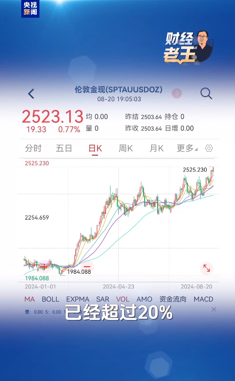 8月16日,国际现货黄金价格历史上首次突破2500美元/盎司。昨天(20日),现货黄金价格再创新高,一度超过2520美元/盎司。