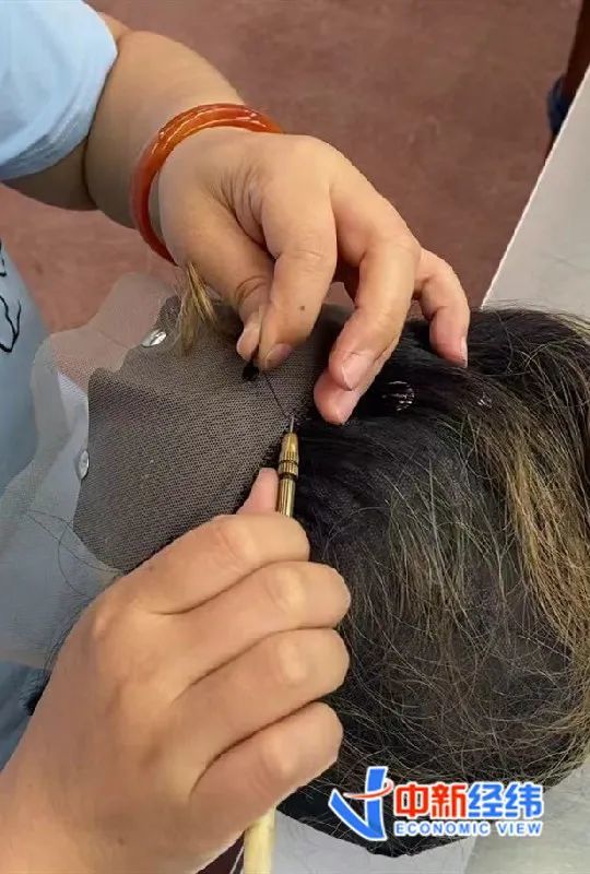 田良军表示,为了让假发更加逼真,假发企业的高端手工艺产品会采用递针工艺,即将头发钩织在中间的蕾丝发网上,然后从最上层的中国绢网上递出来,下面再覆一层亲肤舒适的发网。这种产品需要按照人的头皮样式、颜色、肤色去制作,每一平方厘米有多少根头发,每一个部位有什么角度有严格规定,哪怕是熟练的手工艺人,也需要5到7天才能制作一顶全头假发。