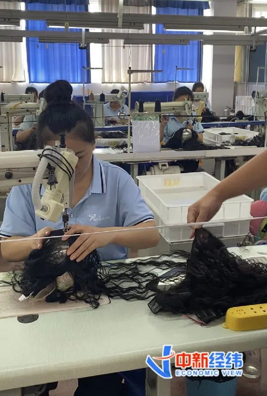范莹莹表示,不是所有的假发都需要全手工制作,现在更多地采用机器制作。像高针机、平缝机的使用,大大提升了生产效率,一个两百多人的流水线车间,一天能经手3000多套假发。