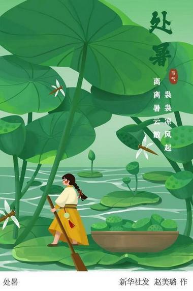 他们亦写“收获”。处暑时,稻穗迎接农人的检阅;在清风徐徐、兰舟微荡处,菱角结实饱满,江南女子身着布衣钗裙,边歌边采……此时,丰收的喜悦传遍人间。面对此情此景,唐代元稹的《咏廿四气诗·处暑七月中》这样写道:“气收禾黍熟,风静草虫吟。缓酌樽中酒,容调膝上琴。”