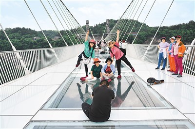 韩国游客在湖南省张家界大峡谷景区玻璃桥拍照。 新华社记者 陈振海摄