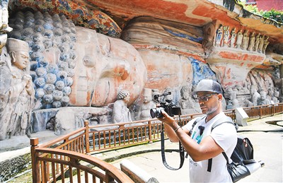 外籍游客在重庆大足石刻景区游览。 新华社记者 王全超摄
