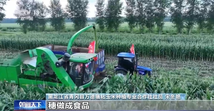 黑龙江省青冈县万德福粘玉米种植专业合作社社员 宋冬艳:把整个植株的茎收回来做饲料,穗做成食品,这样整个全株都充分利用好了。每台机械现在是平均一天采收80亩地。