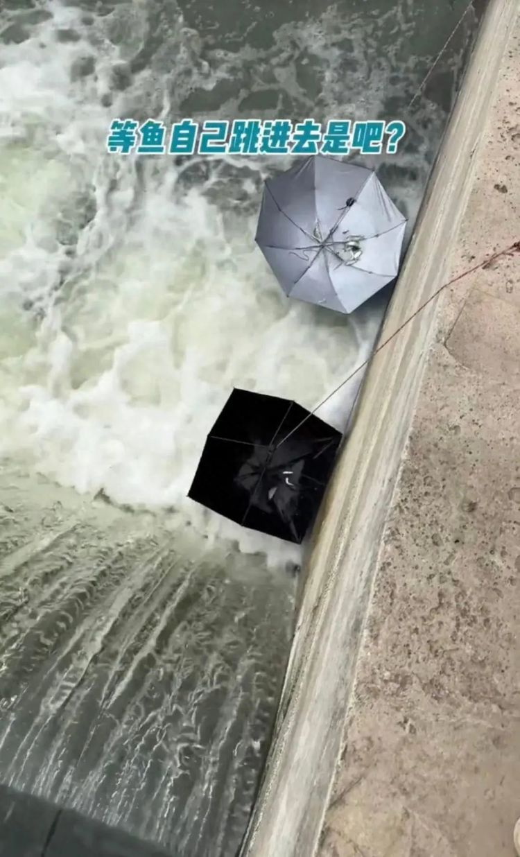 据市民提供的视频显示,有人在出水口处,放置倒置的伞面。随着水流高度差,鱼会自动跳入伞内,不一会儿就能钓上半桶。