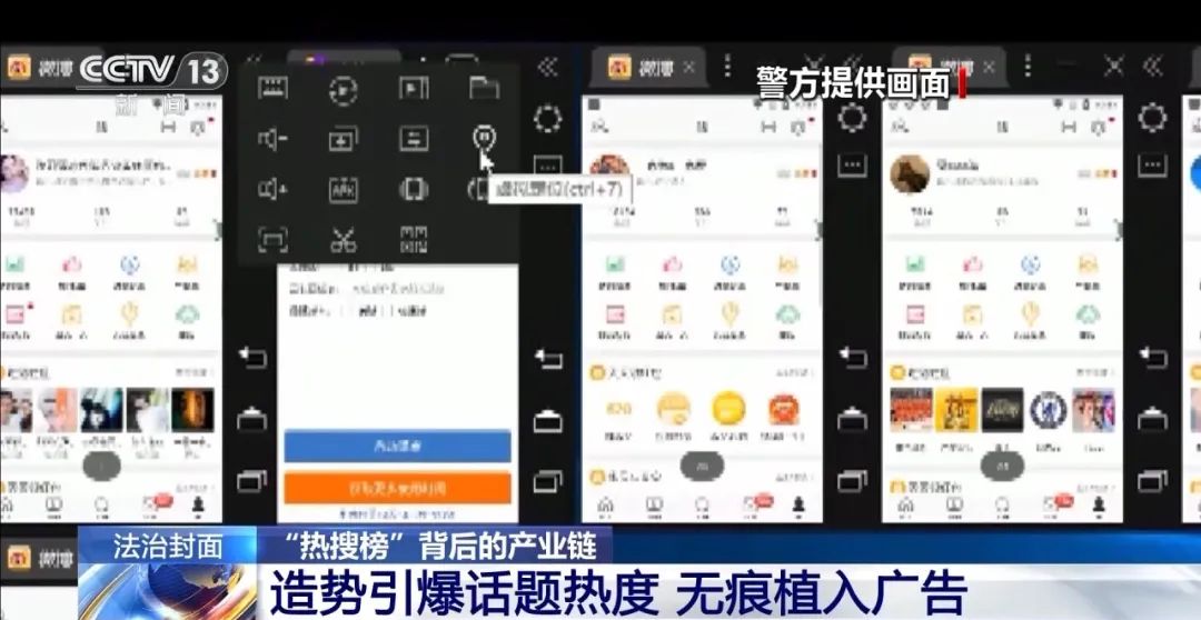 警方在张某的工作室里发现,10台电脑上都安装了大量的手机模拟器,每个手机模拟器上,都登录了微博账号,并且都安装了一个名为“千语中控”的软件,可以对微博账号自动进行点赞、评论、转发。据统计,张某工作室每台电脑装有50个手机模拟器,10台电脑就可控制500个微博账号。